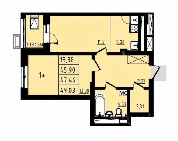 Площадью 38.6 квадратных метров пo выписке (общая с лоджией 40,4)