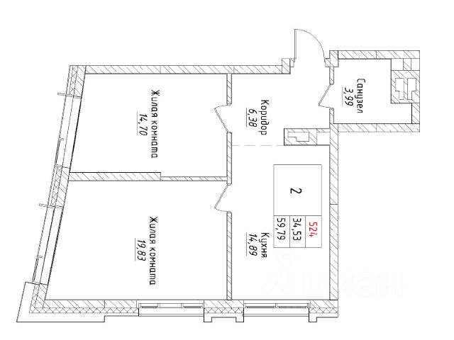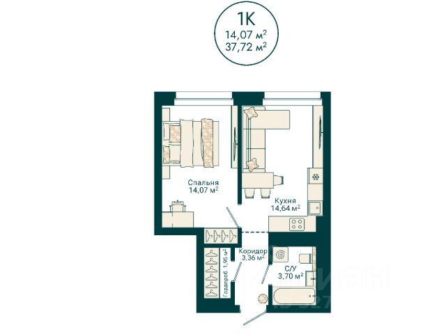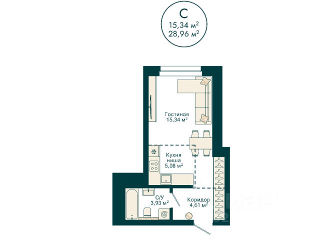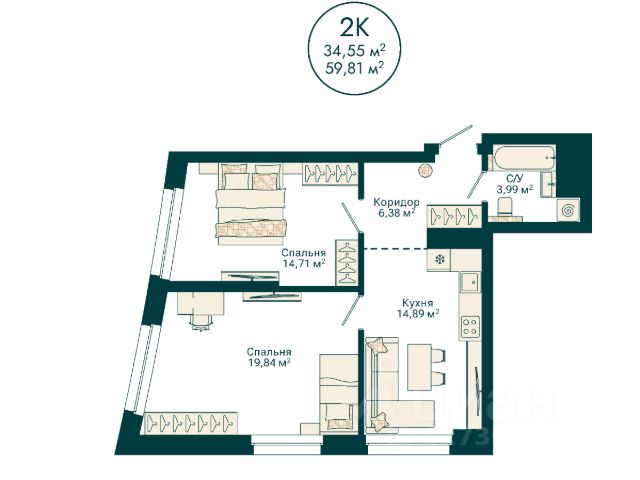 кухня-гостиная — 14,89 кв.м.