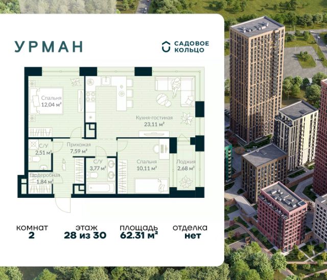 Успейте забронировать по акционной цене! Стоимость квартиры указана со скидкой, ваша выгода составит 646768 рублей. Предложение ограничено. Звоните, чтобы узнать подробнее! Продается квартира в ЖК Urman City с 2 спальнями на 28 этаже 30 этажного дома. Общая площадь: 62.31 кв.м. Высота потолков 2.95 м. Срок сдачи 2 квартал 2026 г. Окна выходят на 2 стороны. Вид на лес. Вид на воду. Угловое остекление. Эскроу-счет. Застройщик ГК "Садовое кольцо". -Расположение Urman расположен прямо в сердце лесного массива. Прогулка по благоустроенным лесным тропам или 10 мин езды до центра города — выбор за вами. Собственная дорога через лес обеспечивает приватность и тишину, защищая от городского шума. -Инфраструктура Urman предлагает разнообразную собственную инфраструктуру: спортивные зоны, детские площадки, кафе и уютные общественные пространства. Планировки квартир продуманы до мелочей, обеспечивая комфорт и функциональность. -Архитектура Неоклассические пропорции, игра стекол и оттенков кирпича, вдохновленная североевропейскими мотивами, создают уникальный облик комплекса. Разновысотные корпуса открывают впечатляющие виды на лес и реку, делая каждый дом по-настоящему особенным. -Внутренний двор Закрытый трехуровневый двор впечатляет гармонией и уютом. Продуманный ландшафт и связь с окружающим лесом создают идеальное пространство для отдыха, прогулок и семейного времяпрепровождения. -Входные группы Входные группы оформлены элегантно и продуманно. Акцентные элементы, ландшафтные композиции и представительская зона в стиле эко-лофт создают эффект "портала" в приватный мир комплекса.