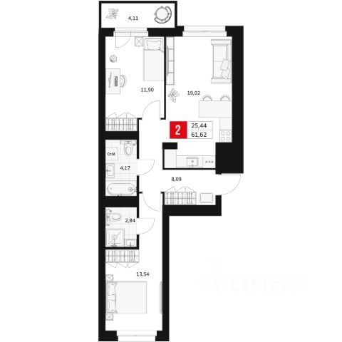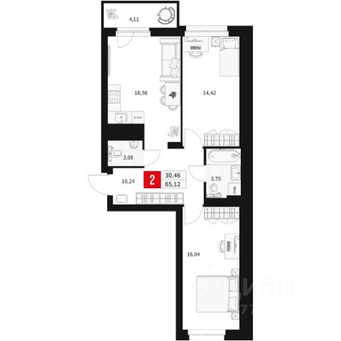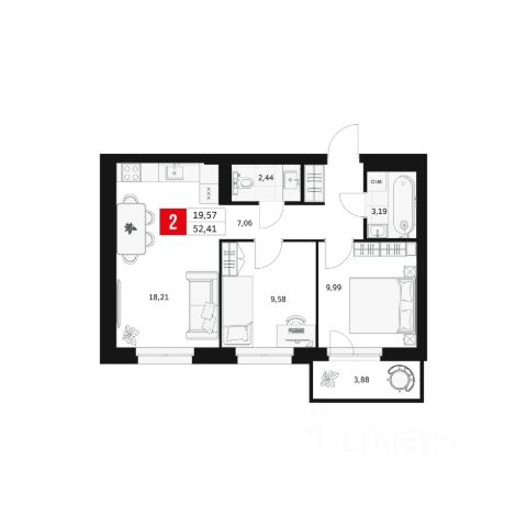 • Двухкомнатная квартира для семьи или молодых людей 59,4 м • Два санузла 4,2 м и 1, 7 м • Функциональный холл 10 м с возможностью обустроить шкаф-купе по периметру или мини-гардеробную • Спальня 12,5 м • Светлая детская 11,4 м • Кухня-гостиная 18 м с выходом на балкон, который можно обустроить под кабинет или приватную зону отдыха