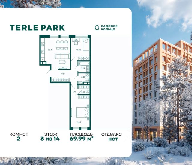 Продается квартира в ЖК Terle Park с 2 спальнями на 2 этаже 14 этажного дома. Общая площадь: 71.49 кв.м. Высота потолков 2.95 м. Срок сдачи 4 квартал 2025 г. Вид на лес. Эскроу-счет. Застройщик ГК "Садовое кольцо". -Расположение Terle Park расположен на улице Авроры, в экологически чистом районе "Зелёная роща", на границе с лесопарком, который огибает река Уфа. Здесь можно наслаждаться чистым воздухом пригородной зоны, оставаясь в городской черте, с быстрым доступом к основным магистралям Уфы и удобной транспортной инфраструктурой. -Инфраструктура Комплекс расположен в шаговой доступности от ключевых образовательных учреждений: детский сад 24, лицей 5, школа 119. Практически через дорогу — станция скорой помощи, кардиологический центр, Республиканская детская больница и Республиканский перинатальный центр, что обеспечивает быстрый доступ к медицинской помощи. -Архитектура Шесть корпусов переменной этажности (от 10 до 29 этажей) гармонично вписываются в природный ландшафт района Зелёной рощи". Каждый корпус имеет индивидуальное оформление, подчеркивающее уникальность и современность комплекса. Дома возводятся по кирпично-монолитной технологии с навесным фасадом, что обеспечивает долговечность и эстетическую привлекательность. -Внутренний двор Внутренняя территория представляет собой уютный парк для жителей, где всё продумано до мелочей. Закрытый двор без машин обеспечивает безопасность и уют. Пространство разделено на различные зоны для отдыха: от прогулочных маршрутов и лаунж-зон, до террас для йоги и медитаций. Для общения и ярких событий будет обустроена событийная площадь. Для любителей спорта на территории предусмотрены воркаут зона, настольный теннис и многофункциональная площадка для игр. -Входные группы Подъезды расположены на уровне земли — удобно для колясок, велосипедов и самокатов. Лобби в светлой палитре с зелёными и оранжевыми акцентами дополняет рабочая зона для встреч и онлайн-конференций. В домах предусмотрены современные бесшумные лифты.