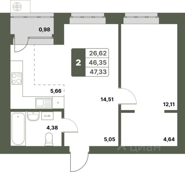 Продается 2-к-комнатная квартира в ЖК "Свой Берег" от ГК "Архстрой Групп". 4-й этаж 12-этажного жилого дома, общая площадь 47.28 кв.м., жилая площадь 27.83 кв.м. Отделка получистовая.