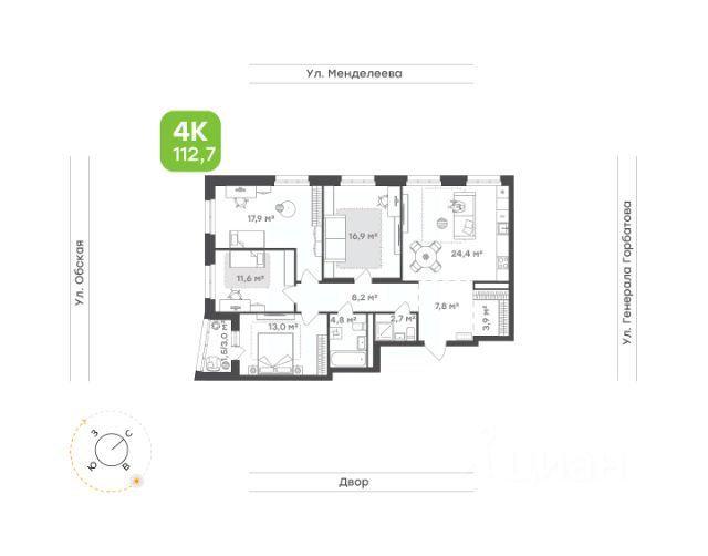 • Большая и функциональная четырехкомнатная квартира для семьи с двумя и более детьми 112,7 м • Практичное зонирование каждой комнаты • Дополнительное окно в светлой кухне-гостиной 24,4 м • Родительская спальня 17,9 м с нишей под шкаф-купе • 3 уютных детских 16,1 м., 13 м и 11,6 м. Одна спальня с личным выходом на балкон • Два санузла 4,8 м и 2,7 м • Функциональный холл 19,9 м с возможностью обустроить мини-гардеробную 3,9 м