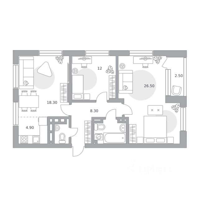 Три спальных комнаты. Мастер-спальня 16,2 м с личным санузлом 4,3 м и возможностью обустроить гардеробную, вход в которую будет только у хозяев спальни. И еще 2 уютных детских 11, 3 м и 11,3 м.