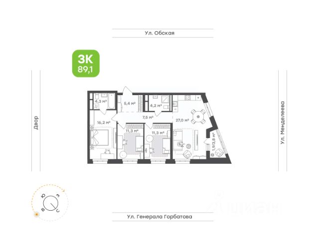 • Бестселлер • Трехкомнатная квартира для семьи с двумя и более детьми 89,1 м • Уникальная геометрия квартиры • Практичное зонирование каждой комнаты • Мастер-спальня 16,2 м с личным санузлом 4,3 м и возможностью обустроить гардеробную, вход в которую будет только у хозяев спальни • Большая кухня-гостиная 27 м с 2 дополнительными окнами и выходом на балкон • Два санузла 4,3 м и 4,2 м • 2 уютных детских 11, 3 м и 11,3 м • Функциональный холл 12,9 м