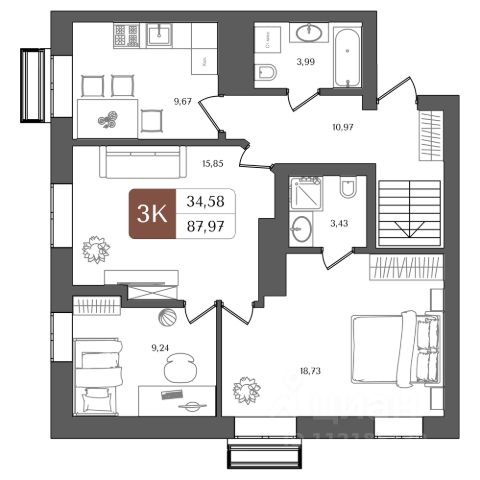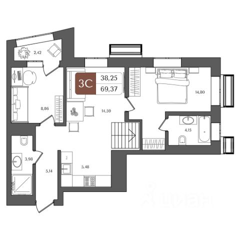 Современная планировка: просторная кухня-гостиная 20 кв.м. С ТРЕМЯ ОКНАМИ, 2 изолированные спальни 11,4 и 11,3 кв.м., 2 санузла 3,8 и 2,5 кв.м., прихожая с нишей для шкафа-купе кв.м.