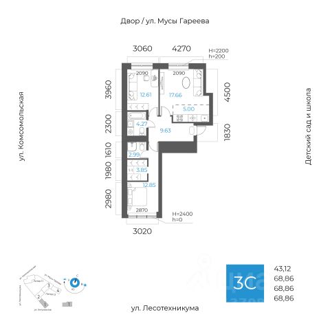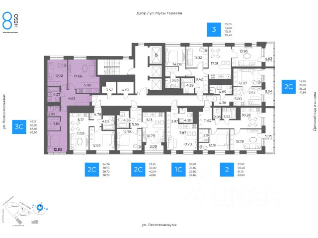 3-к квартира в 8 НЕБО; По адресу: ул. Лесотехникума Литер 1, Секция 1. 30-й этаж 32- этажного жилого дома Общая площадь 74.70кв.м.; Жилая площадь 41.89 кв. м. от ГК "Первый Трест". Срок окончания строительства: 3 квартал 2027 года. Квартира с свободной планировкой, позволяющей реализовать любые дизайнерские решения: - Стены выровнены и оштукатурены, готовые под финишную отделку по вашему вкусу. - Пол: выполнена стяжка, обеспечивающая ровное основание для любых напольных покрытий. - Электрика: разводка выполнена до щитка, что обеспечивает безопасность и удобство при дальнейшем монтаже. - Отопление: установлены радиаторы и выполнена полная разводка системы отопления. - Водоснабжение: выведены коммуникации под воду, готовые для установки сантехнического оборудования. ЖК 8 Небо - это восемь домов в самом современном районе столицы. Вы попадаете в уютное, но при этом динамичное пространство, открытое солнечным лучам. Здесь вы найдете для счастья всё, вне зависимости от того, что вкладываете в это понятие. - Счастье, когда всё рядом. Открытая прогулочная улица на территории комплекса, крупнейший торговый центр в 10 минутах ходьбы, прямой доступ к ключевым транспортным магистралям города - Счастье в эстетике. 8 разновысотных зданий, созданных при участии шведских архитекторов. - Счастье в красоте, функциональности и безопасности. Просторные дизайнерские холлы с уникальным дизайном для - Счастье в благоустроенной территории. Многоярусный внутренний двор с разнообразными зонами озеленения и общественными пространствами. - Счастье жить с единомышленниками. Соседский центр - уютное пространство для отдыха и площадка для воплощения идей, доступ к которой будет у всех жителей комплекса. Архитектура ЖК 8 Небо создан при участии шведских архитекторов, которые привнесли в проект элементы скандинавской культуры. Разновысотные здания выполнены из экологически-безопасных материалов. Базовая отделка фасадов: декоративная плитка с имитацией кирпича, фиброцементные панели и витражи из алюминиевого сплава. Всё это соответствует скандинавскому стилю, сочетая минимализм и эстетику. Паркинг Жилой комплекс оборудован просторным и безопасным подземным паркингом с системой бесконтактного доступа по номеру автомобиля. Изнутри же попасть в него можно просто спустившись на лифте с любого этажа. Благоустройство Открытый квартал для прогулок наполнит район необходимыми элементами приятной и комфортной жизни: эстетичные арт-объекты, облагороженная зона отдыха, магазины, рестораны, студии развития и творчества, салоны красоты. А закрытая территория, доступная только владельцам квартир жилого комплекса и их гостям, обеспечит уединение и безопасность. Весело и с пользой провести время теперь можно не выходя за пределы своего жилого комплекса. Инфраструктура в радиусе километра Школы - Собственная школа на территории комплекса - МАОУ Школа 88 - Школа 97 им. Г.А. Ахмерова - Лицей 6 им. Сафина Н.Д. - Лицей 42 -