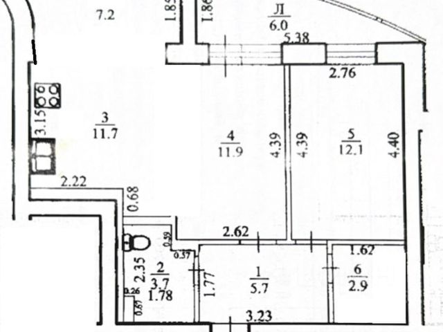 Площадь квартиры с учётом лоджии и балкона - 51,6 кв м , без учёта балкона и лоджии - 49 кв м, зал- 17,1 кв м, спальная - 11,1 кв м, кухня- 7 кв м, прихожая -8.6 кв м, гардеробная-1,7 кв м., балкон площадью 2,7 кв м и лоджия площадью 3,6 кв м застеклены рамами ПВХ.