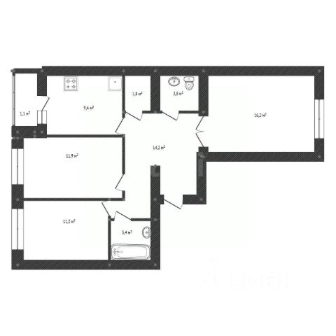 В квартире высокие потолки 2.7 и большие оконные проемы дающие много света в каждую комнату. Добротная кухня 11.6 квадратов с выходом на лоджию. Два санузла, 4.2 и 3.6 квадратов, один из которых можно превратить в просторную гардеробную, кладовую или кабинет. Две комнаты 13.4 и 10.6 квадратов и зал 18.4 квадрата.