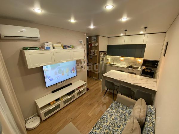 - Кухня-гостиная 17,8 м2, с двумя панорамными окнами;