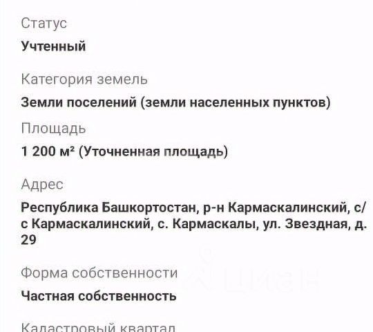 Продается участок 12 соток в с. Кармаскалы. Идеальное место для строительства дома! 12 соток участок ровный, удобный для застройки и(или) садоводства. Удобный подъезд к селу. Развитая инфраструктура - магазины, кафе, больница. Чистый воздух, спокойствие и красота природы. Тихо, красиво, экологически чисто, в окружении природы. Не упустите возможность создать свой уголок гармонии среди природы! Для покупателей готовых выйти на сделку возможен торг. Звоните!