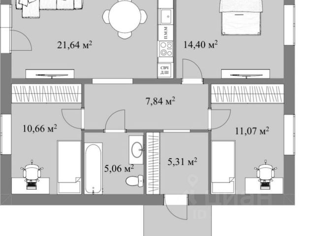 Просторная прихожая (20.9 кв.м), кухня (20.7 кв.м), гостиная (31.1 кв.м),