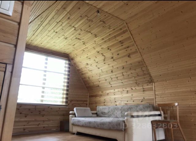 Второй этаж бани ,мансарда, обшита имитацией бруса, на полу ковролин, кровать, комод, вешалка
