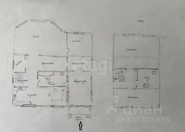 В доме располагаются: холодный тамбур, прихожая, кухня, гостиная, 2 спальных комнаты, санузел.