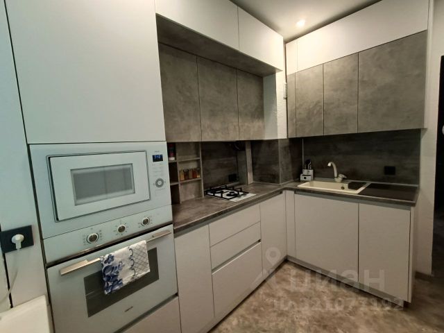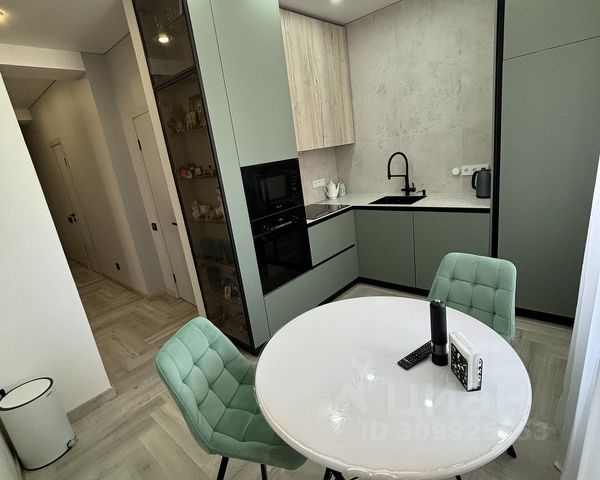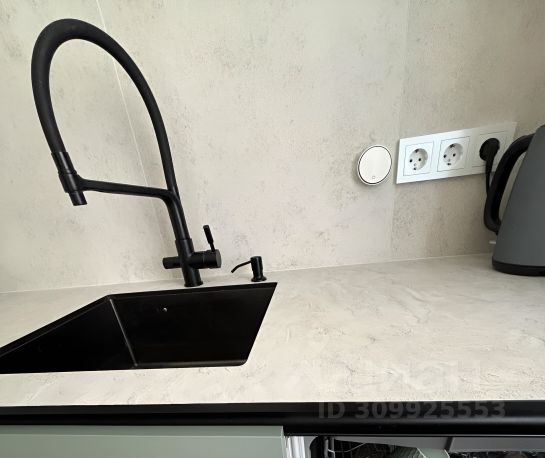 встроенная, фасады - пластик, столешница из компакт-плиты, под раковиной установлен измельчитель бытовых отходов Воrt, система фильтрации воды Гейзер, сенсорная подсветка, фурнитура Вlum. Кухонный фартук выполнен из керамогранита.