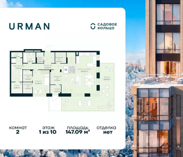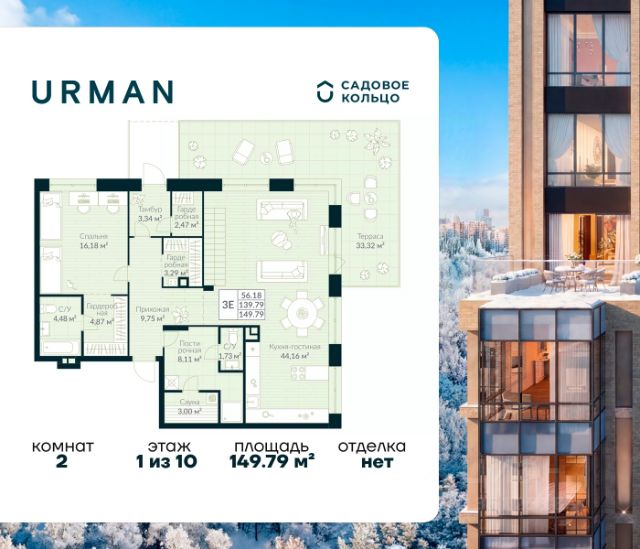Успейте забронировать по акционной цене! Стоимость квартиры указана со скидкой, ваша выгода составит 1076376 рублей. Предложение ограничено. Звоните, чтобы узнать подробнее! Продается квартира в ЖК Urman City с 2 спальнями на 1 этаже 10 этажного дома. Общая площадь: 149.79 кв.м. Высота потолков 2.7 м. Срок сдачи 2 квартал 2026 г. Окна выходят на 2 стороны. Сауна. Мастер-спальня. Патио. Вид на лес. Угловое остекление. Окно в ванной. Двухуровневая квартира. Эскроу-счет. Застройщик ГК "Садовое кольцо". -Расположение Urman расположен прямо в сердце лесного массива. Прогулка по благоустроенным лесным тропам или 10 мин езды до центра города — выбор за вами. Собственная дорога через лес обеспечивает приватность и тишину, защищая от городского шума. -Инфраструктура Urman предлагает разнообразную собственную инфраструктуру: спортивные зоны, детские площадки, кафе и уютные общественные пространства. Планировки квартир продуманы до мелочей, обеспечивая комфорт и функциональность. -Архитектура Неоклассические пропорции, игра стекол и оттенков кирпича, вдохновленная североевропейскими мотивами, создают уникальный облик комплекса. Разновысотные корпуса открывают впечатляющие виды на лес и реку, делая каждый дом по-настоящему особенным. -Внутренний двор Закрытый трехуровневый двор впечатляет гармонией и уютом. Продуманный ландшафт и связь с окружающим лесом создают идеальное пространство для отдыха, прогулок и семейного времяпрепровождения. -Входные группы Входные группы оформлены элегантно и продуманно. Акцентные элементы, ландшафтные композиции и представительская зона в стиле эко-лофт создают эффект "портала" в приватный мир комплекса.