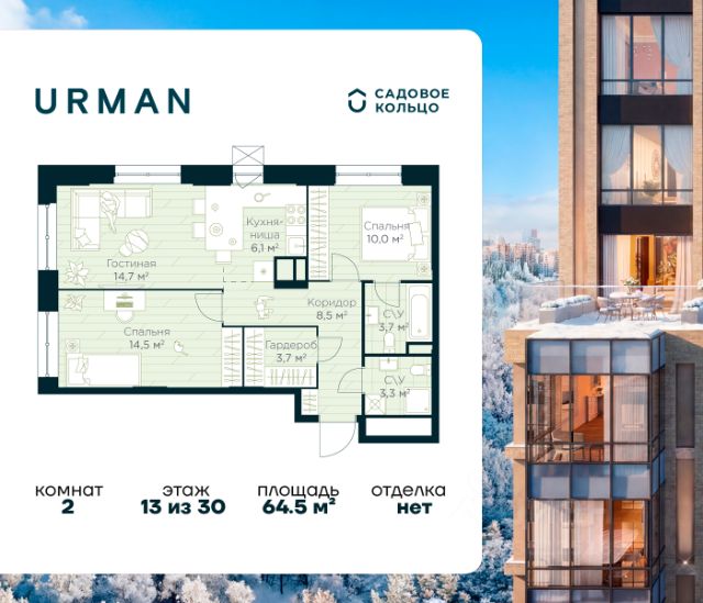 Продается квартира в ЖК Urman City с 2 спальнями на 13 этаже 30 этажного дома. Общая площадь: 61.5 кв.м. Высота потолков 2.95 м. Срок сдачи 1 квартал 2028 г. Мастер-спальня. Эскроу-счет. Застройщик ГК "Садовое кольцо". -Расположение Urman расположен прямо в сердце лесного массива. Прогулка по благоустроенным лесным тропам или 10 мин езды до центра города — выбор за вами. Собственная дорога через лес обеспечивает приватность и тишину, защищая от городского шума. -Инфраструктура Urman предлагает разнообразную собственную инфраструктуру: спортивные зоны, детские площадки, кафе и уютные общественные пространства. Планировки квартир продуманы до мелочей, обеспечивая комфорт и функциональность. -Архитектура Неоклассические пропорции, игра стекол и оттенков кирпича, вдохновленная североевропейскими мотивами, создают уникальный облик комплекса. Разновысотные корпуса открывают впечатляющие виды на лес и реку, делая каждый дом по-настоящему особенным. -Внутренний двор Закрытый трехуровневый двор впечатляет гармонией и уютом. Продуманный ландшафт и связь с окружающим лесом создают идеальное пространство для отдыха, прогулок и семейного времяпрепровождения. -Входные группы Входные группы оформлены элегантно и продуманно. Акцентные элементы, ландшафтные композиции и представительская зона в стиле эко-лофт создают эффект "портала" в приватный мир комплекса.