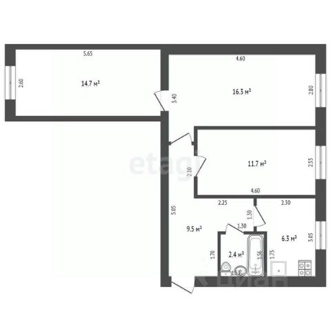 общая площадь по документам 56,7 кв.м;