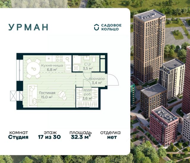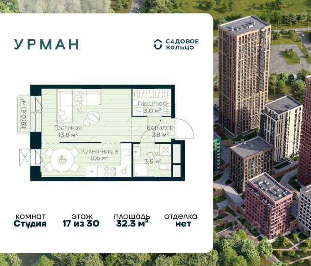 Продается квартира в ЖК Urman City студия на 4 этаже 30 этажного дома. Общая площадь: 32.3 кв.м. Высота потолков 2.95 м. Срок сдачи 1 квартал 2028 г. Эскроу-счет. Застройщик ГК "Садовое кольцо". -Расположение Urman расположен прямо в сердце лесного массива. Прогулка по благоустроенным лесным тропам или 10 мин езды до центра города — выбор за вами. Собственная дорога через лес обеспечивает приватность и тишину, защищая от городского шума. -Инфраструктура Urman предлагает разнообразную собственную инфраструктуру: спортивные зоны, детские площадки, кафе и уютные общественные пространства. Планировки квартир продуманы до мелочей, обеспечивая комфорт и функциональность. -Архитектура Неоклассические пропорции, игра стекол и оттенков кирпича, вдохновленная североевропейскими мотивами, создают уникальный облик комплекса. Разновысотные корпуса открывают впечатляющие виды на лес и реку, делая каждый дом по-настоящему особенным. -Внутренний двор Закрытый трехуровневый двор впечатляет гармонией и уютом. Продуманный ландшафт и связь с окружающим лесом создают идеальное пространство для отдыха, прогулок и семейного времяпрепровождения. -Входные группы Входные группы оформлены элегантно и продуманно. Акцентные элементы, ландшафтные композиции и представительская зона в стиле эко-лофт создают эффект "портала" в приватный мир комплекса.