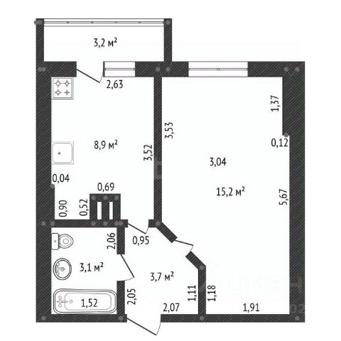 Общая площадь с учетом балкона (с коэффициентом 0,3) 37,2 кв.м.