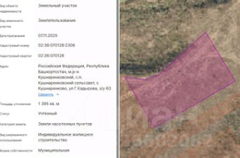 Земельный участок, кадастровый номер 02:36:070128:2306, площадью 1395 кв.м., расположенного по адресу: Республика Башкортостан, Кушнаренковский р-н, с/с. Кушнаренковский, с.Кушнаренково , ул. Г.Кадырова, уч.63, с видом разрешен...