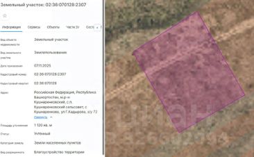 Земельный участок с кадастровым номером 02:36:070128:2307 площадь 1120 по адресу Российская Федерация, Республика Башкортостан, м.р-н Кушнаренковский, с.п. Кушнаренковский сельсовет, с Кушнаренково, ул Г.Кадырова, з/у 72
