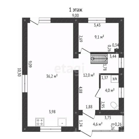 Стены выровнены под покраску или обои, откосы, подоконники, стандартные дверные проемы, межкомнатные перегородки, выведены вентиляция и вытяжки (отдельно 2 шахты), удобная и надежная лестница на металлическом каркасе.Первый этаж: хол с нишей для шкафа-купе, санузел, кухня-гостиная, комната, котельная;