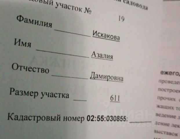 Пpoдам учacтoк 8 cоток в собственности. Кадастровывй номер 02:55:040513:2216 Адрес: Башкортостан респ, г Уфа, Калининский р-н, СНТ "Вишенка", участок 332,334, улицa за деревней Федорoвка, за Kаpпoвo нa гopе в cторону Базилевки. Участок ровный огороженный, электричество круглый год, Подвели газ. установили вышку 3,4 g связь. МЕСТОПОЛОЖЕНИЕ: расстояние до СНТ примерно 20 км (от Монумента Дружбы или от Стадиона Гастелло примерно одинаково). Рядом микрорайон Федоровка, также неподалеку Елкибаево, Русский Юрмаш. КАК ДОЕХАТЬ НА ОБЩЕСТВЕННОМ ТРАНСПОРТЕ: от Ледового дворца Уфа Арена через Монумент Дружбы до Шакши ходит Маршрутка 291 (бывший 300), с дк УМПО до д. Базилевка - Маршрутка 215. Электричество есть, дороги ровные. Место тихое спокойное, огорожено лесопосадкой. В СНТ люди живут круглый год. Один взрослый собственник. В перспективе рядом с СНТ будет проходить восточный выезд из Уфы, что ускорит время поездки в 2-3 раза (расстояние от города будет примерно 7 км). Неподалеку сады УМПО, Базилевка, Ольховик, Содружество, Озон, Каскад, Актан, Лотос, Черёмушки Маршрутка 291 (бывший 300) ходит от Ледового дворца (Уфа Арена) через Монумент Дружбы до Шакши., 215 с дк УМПО до д. Базилевка.