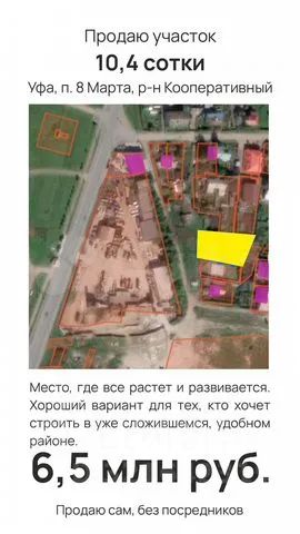 Продаю земельный участок без посредников. Назначение: для индивидуального жилищного строительства Площадь участка: 1042 кв.м (10,42 сотки) Кадастровый номер участка: 02:55:050229:4947 Республика Башкортостан, г. Уфа, Ленинский район, ул. Агрономическая поселок 8 марта Участок расположен в 20 минутах от центра города Уфа и будет отличным вариантом для тех, кто хочет строиться в уже сложившемся и удобном районе со всей необходимой для комфортной жизни инфраструктурой, рядом находятся продуктовые магазины, автосервисы и автомойки, что является дополнительным плюсом для обладателей собственного авто. Стоит отметить и близкое расположение школы, наличие заведений общепита и активное развитие района нахождения участка. Так, рядом уже строится торговый комплекс с термальными бассейнами. По всем вопросам обращайтесь по номеру телефона.