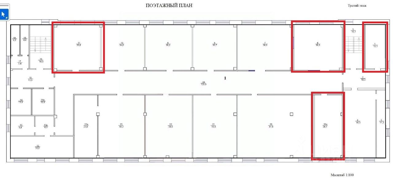 Сдаются помещения общей площадью 116,9 кв. м на 3 этаже в здании по адресу: г. Белорецк, ул. Ленина, 41. Свободные помещения отмечены на схеме.