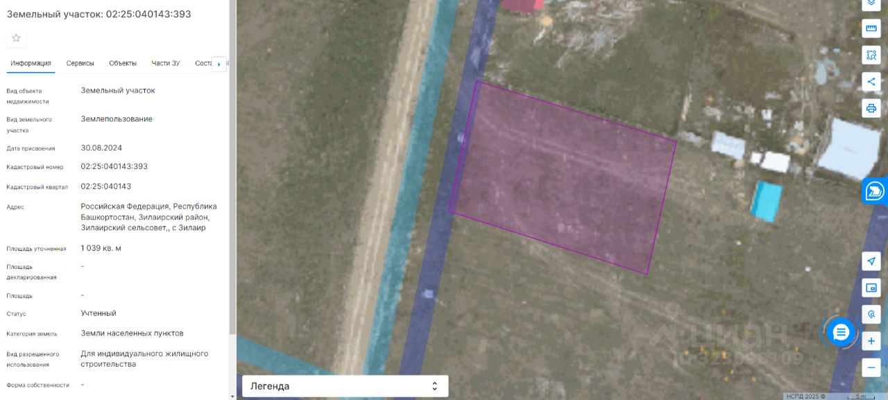 Земельный участок категории земли населенных пунктов, с кадастровым номером 02:25:040143:393, общей площадью 1039 кв.м., расположенного по адресу: Российская Федерация, Республика Башкортостан, Зилаирский район, Зилаирский сельсовет, с. Зилаир, с видом разрешенного использования для индивидуального жилищного строительства