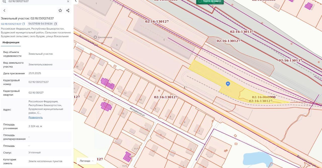 Земельный участок, из категории земель: земли населенных пунктов, расположенного по адресу: Российская Федерация, Республика Башкортостан, Буздякский муниципальный район, Сельское поселение Буздякский сельсовет, Село Буздяк, улица Вокзальная, с кадастровым номером 02:16:130127:637, площадью 3324 кв. м., с видом разрешенного использования "Обслуживание железнодорожных перевозок".