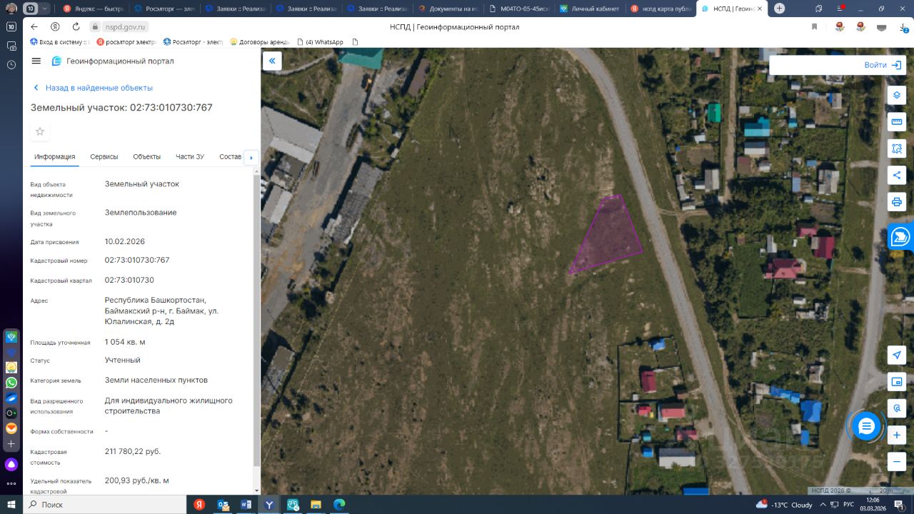 Земельный участок категории земли населенных пунктов, с кадастровым номером 02:73:010730:767, общей площадью 1054 кв.м., расположенного по адресу: Республика Башкортостан, Баймакский район, город Баймак, улица Юлалинская, дом 2 д, с видом разрешенного использования для индивидуального жилищного строительства