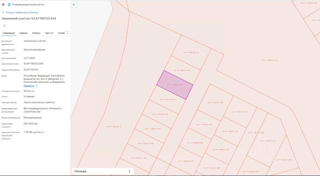 Земельный участок с кадастровым номером 02:47:190103:244, площадью 800 кв.м. с видом разрешенного использования "Для индивидуального жилищного строительства", расположенного по адресу: Республика Башкортостан, Уфимский район, Ольховский сельсовет, д. Федоровка, ул. Лесная, з/у 19