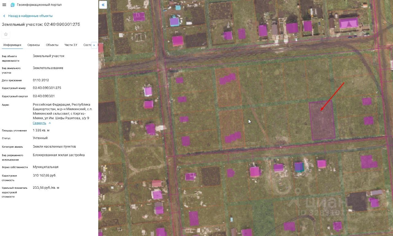 Земельный участок, категории земли населенных пунктов, с кадастровым номером 02:40:090301:275, площадью 1328 кв.м., расположенный по адресу:Республика Башкортостан, Миякинский район, с. Киргиз-Мияки, ул. им. Шифы Разяпова, з/у 9, с видом разрешенного использования "блокированная жилая застройка"