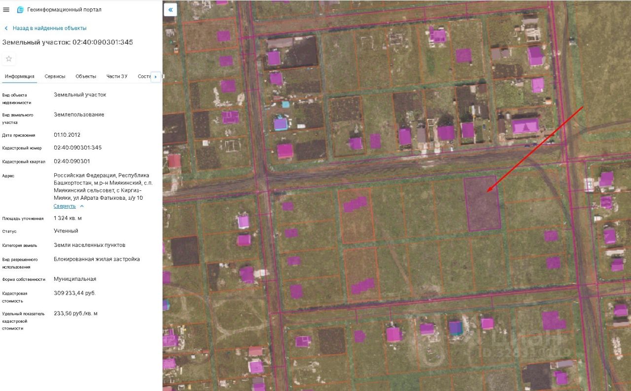 Земельный участок, категории земли населенных пунктов, с кадастровым номером 02:40:090301:345, площадью 1324 кв.м. , расположенный по адресу: Республика Башкортостан, Миякинский район, с.Киргиз-Мияки, ул. им. Айрата Фатыхова, з/у 10 с видом разрешенного использования "блокированная жилая застройка"