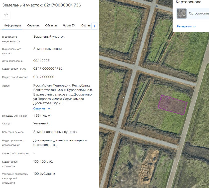 Земельный участок (далее участок), категории земель населенных пунктов, с кадастровым номером 02:17:000000:1736 площадью 1554 кв. м, расположенного по адресу: Российская Федерация, Республика Башкортостан, м.р-н Бураевский, с.п. Бураевский сельсовет, д Дюсметово, ул Первого имама Сахипкамала Дюсметова, з/у 73, с видом разрешенного использования "Для индивидуального жилищного строительства", с правом строительства зданий, сооружений.