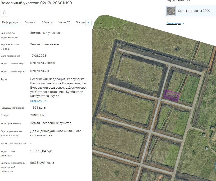 Земельный участок (далее участок), категории земель населенных пунктов, с кадастровым номером 02:17:120601:199 площадью 1694 кв. м, расположенного по адресу: Российская Федерация, Республика Башкортостан, м.р-н Бураевский, с.п. Бураевский сельсовет, д Дюсметово, ул Юртового старшины Курбангали Казбулатова, з/у 44, с видом разрешенного использования "Для индивидуального жилищного строительства", с правом строительства зданий, сооружений.