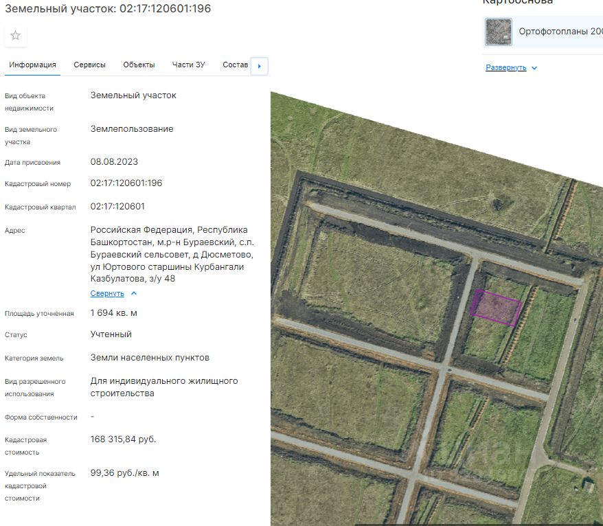 Земельный участок (далее участок), категории земель населенных пунктов, с кадастровым номером 02:17:120601:196 площадью 1694 кв. м, расположенного по адресу: Российская Федерация, Республика Башкортостан, м.р-н Бураевский, с.п. Бураевский сельсовет, д Дюсметово, ул Юртового старшины Курбангали Казбулатова, з/у 48, с видом разрешенного использования "Для индивидуального жилищного строительства", с правом строительства зданий, сооружений.