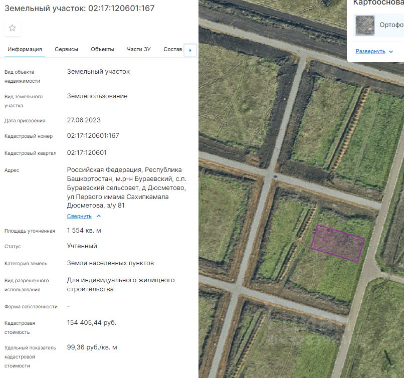 Земельный участок (далее участок), категории земель населенных пунктов, с кадастровым номером 02:17:120601:167 площадью 1554 кв. м, расположенного по адресу: Российская Федерация, Республика Башкортостан, м.р-н Бураевский, с.п. Бураевский сельсовет, д Дюсметово, ул Первого имама Сахипкамала Дюсметова, з/у 81, с видом разрешенного использования "Для индивидуального жилищного строительства", с правом строительства зданий, сооружений.