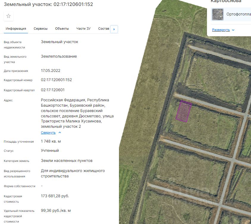 Земельный участок (далее участок), категории земель населенных пунктов, с кадастровым номером 02:17:120601:152 площадью 1748 кв. м, расположенного по адресу: Российская Федерация, Республика Башкортостан, Бураевский район, сельское поселение Бураевский сельсовет, деревня Дюсметово, улица Тракториста Малика Хусаинова, земельный участок 2, с видом разрешенного использования "Для индивидуального жилищного строительства", с правом строительства зданий, сооружений.