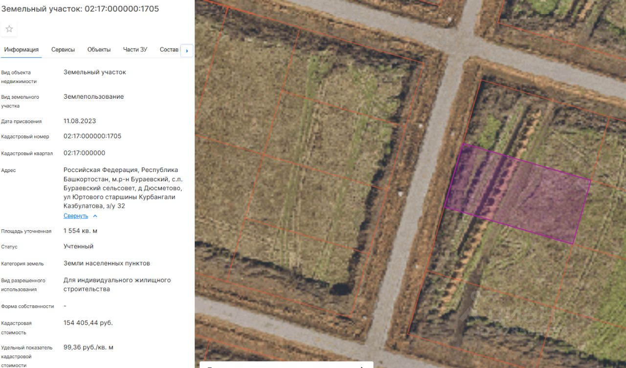 Земельный участок (далее участок), категории земель населенных пунктов, с кадастровым номером 02:17:000000:1705 площадью 1554 кв. м, расположенного по адресу: Российская Федерация, Республика Башкортостан, м.р-н Бураевский, с.п. Бураевский сельсовет, д Дюсметово, ул Юртового старшины Курбангали Казбулатова, з/у 32, с видом разрешенного использования "Для индивидуального жилищного строительства", с правом строительства зданий, сооружений.