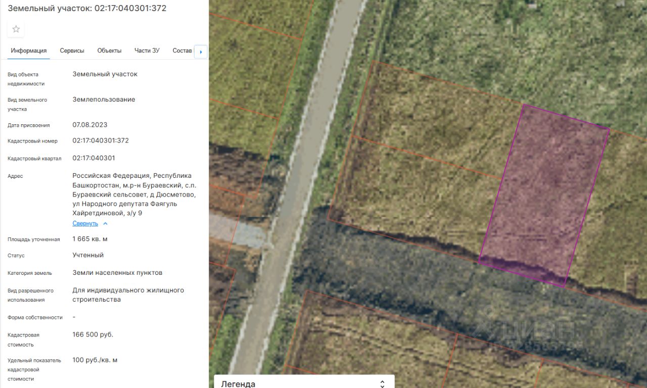 Земельный участок (далее участок), категории земель населенных пунктов, с кадастровым номером 02:17:040301:372 площадью 1665 кв. м, расположенного по адресу: Российская Федерация, Республика Башкортостан, м.р-н Бураевский, с.п. Бураевский сельсовет, д Дюсметово, ул Народного депутата Фаягуль Хайретдиновой, з/у 9, с видом разрешенного использования "Для индивидуального жилищного строительства", с правом строительства зданий, сооружений.