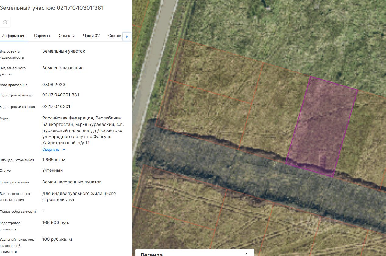 Земельный участок (далее участок), категории земель населенных пунктов, с кадастровым номером 02:17:040301:381 площадью 1665 кв. м, расположенного по адресу: Российская Федерация, Республика Башкортостан, м.р-н Бураевский, с.п. Бураевский сельсовет, д Дюсметово, ул Народного депутата Фаягуль Хайретдиновой, з/у 11, с видом разрешенного использования "Для индивидуального жилищного строительства", с правом строительства зданий, сооружений.