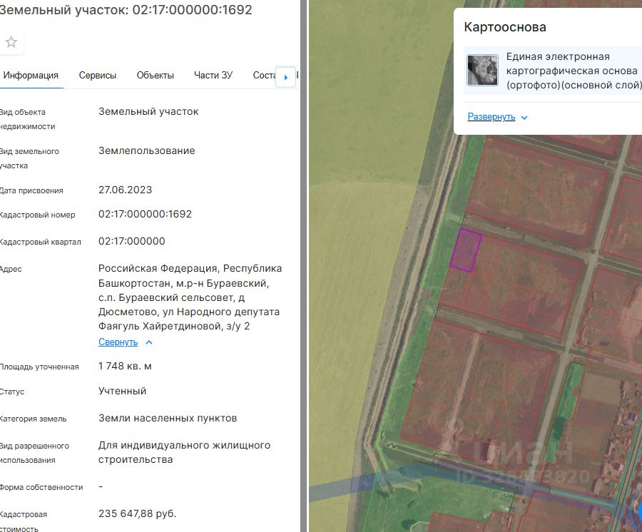 Земельный участок (далее участок), категории земель населенных пунктов, с кадастровым номером 02:17:000000:1692 площадью 1748 кв. м, расположенного по адресу: Российская Федерация, Республика Башкортостан, м.р-н Бураевский, с.п. Бураевский сельсовет, д Дюсметово, ул Народного депутата Фаягуль Хайретдиновой, з/у 2, с видом разрешенного использования "Для индивидуального жилищного строительства", с правом строительства зданий, сооружений.