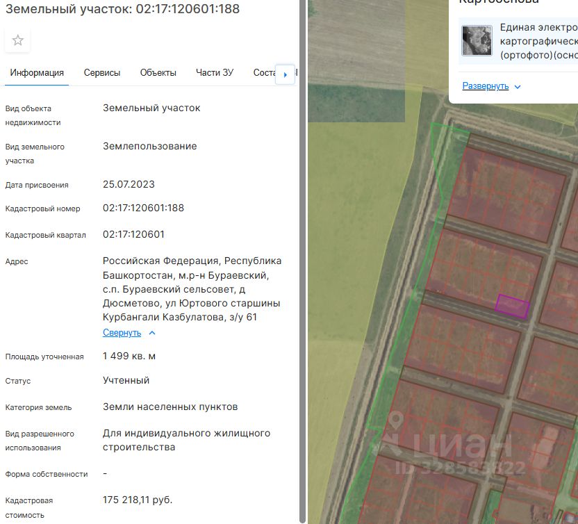 Земельный участок (далее участок), категории земель населенных пунктов, с кадастровым номером 02:17:120601:188 площадью 1499 кв. м, расположенного по адресу: Российская Федерация, Республика Башкортостан, м.р-н Бураевский, с.п. Бураевский сельсовет, д Дюсметово, ул Юртового старшины Курбангали Казбулатова, з/у 61, с видом разрешенного использования "Для индивидуального жилищного строительства", с правом строительства зданий, сооружений.