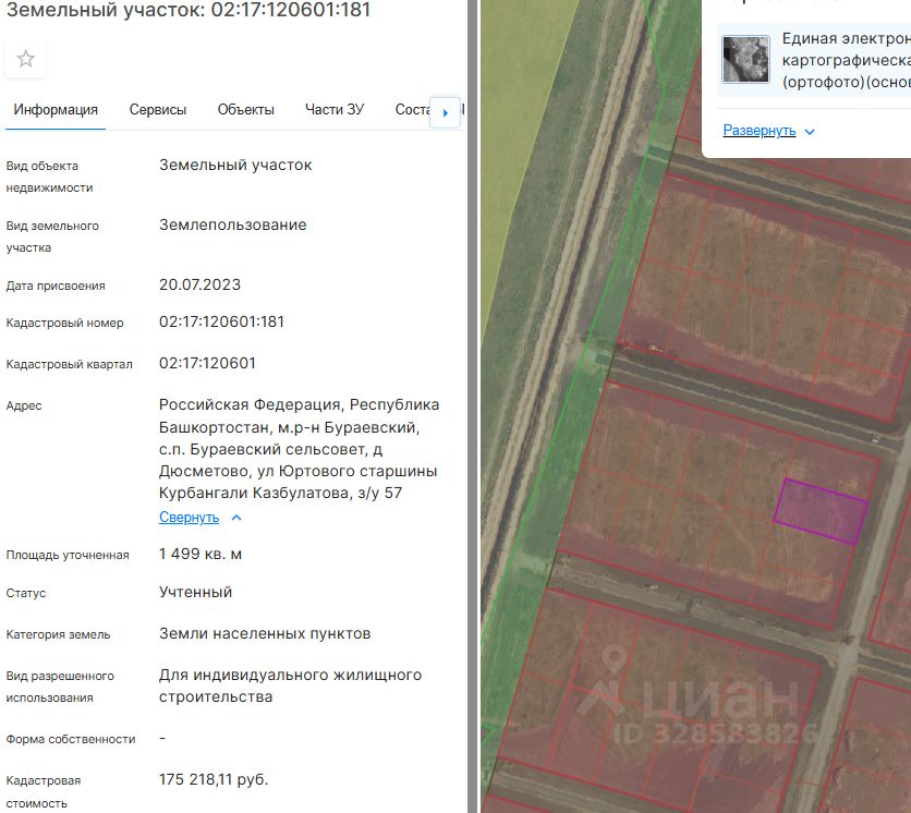 Земельный участок (далее участок), категории земель населенных пунктов, с кадастровым номером 02:17:120601:181 площадью 1499 кв. м, расположенного по адресу: Российская Федерация, Республика Башкортостан, м.р-н Бураевский, с.п. Бураевский сельсовет, д Дюсметово, ул Юртового старшины Курбангали Казбулатова, з/у 57, с видом разрешенного использования "Для индивидуального жилищного строительства", с правом строительства зданий, сооружений.