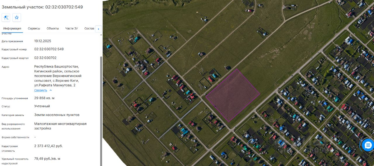 земельный участок с кадастровым номером 02:32:030702:549, площадью-29858 кв.м, категория земель земли населенных пунктов, вид разрешенного использованиямалоэтажная многоквартирная застройка, расположенного по адресу: Республика Башкортостан, Кигинский район, сельское поселение Верхнекигинский сельсовет, с.Верхние Киги, ул. Рафката Махмутова, д.2