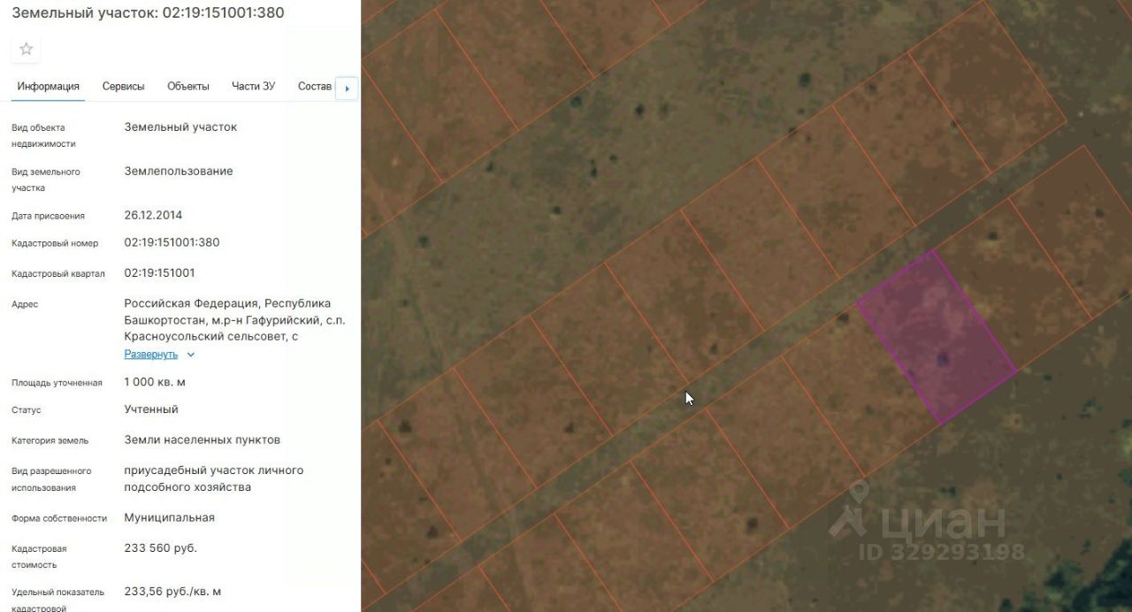 земельный участок из категории земель населенных пунктов, кадастровый номер 02:19:151001:380, площадью 1000+/-11 кв.м., вид разрешенного использования приусадебный участок личного подсобного хозяйства, расположенный по адресу: Республика Башкортостан, Гафурийский район, с/с. Красноусольский, с. Красноусольский, ул. Радужная, з/у 35