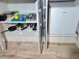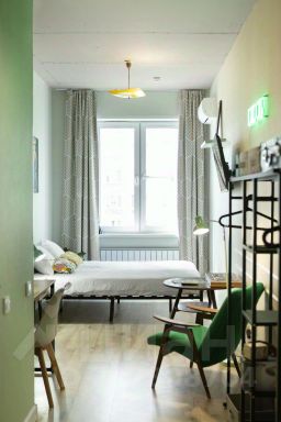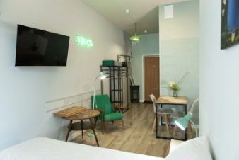Квартира расположена на 9 этаже в новом здании с 3 лифтами и двором со шлагбаумом. В студии с трёхметровыми потолками и видом во двор есть: небольшая гардеробная с местами хранения, отпариватель для одежды, душевая кабина, стиральная машина, фен, одноразовые наборы c зубной пастой и щёткой, шампунь, гель для душа, жидкое мыло, по 2 полотенца на каждого гостя. В обеденной зоне есть полноценная кухня с индукционной плитой, холодильником, чайником, туркой и СВЧ-печью, а также минимальный набор продуктов — сахар, чай, молотый кофе, соль, шоколадные конфеты. Разместиться можно на раскладном диване с топпером. Гостям предоставляются: постельное бельё на двух гостей, плед и дополнительные подушки, плотные шторы, москитная сетка на окне. В студии установлен кондиционер и подключен высокоскоростной Wi-Fi. Парковка во дворе по наличию свободных мест, по периметру здания установлены видеокамеры наблюдения, в также внутри здания на этажах.